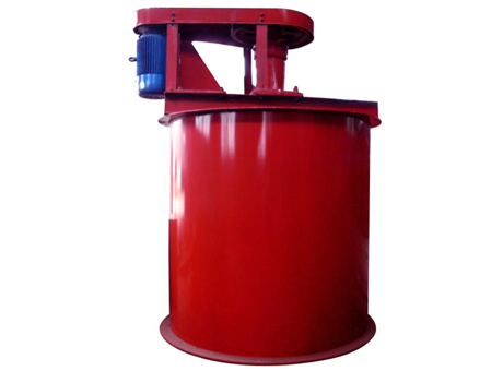 攪拌槽由豎軸部、架子、桶體部、溢流口、電動機、電動機座、電動機座組成。葉輪的旋轉(zhuǎn)是由電動機通過皮帶輪、三角帶而得到葉輪的旋轉(zhuǎn)使礦漿和藥劑攪拌均勻,通過提升裝置從排料斗流出。