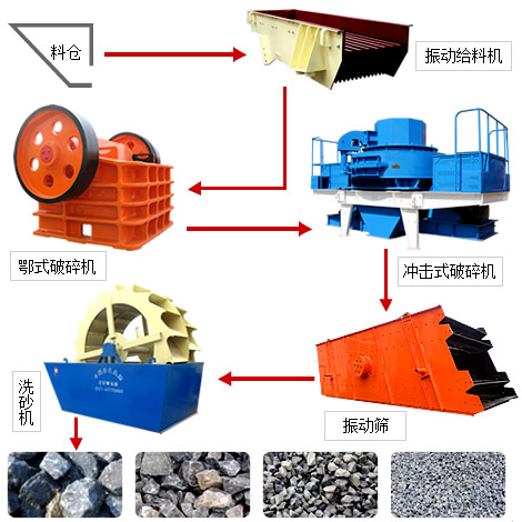 【組成部件】:振動給料機、顎式破碎機、直通沖擊式破碎機(制砂機)、振動篩、洗砂機、膠帶輸送機、集中電控等設(shè)備。